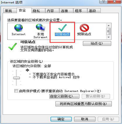 (3)如您的浏览器版本比较高,可通过“工具”--“internet选项”--“安全”--去掉“启用保护模式”的√,如下图所示: